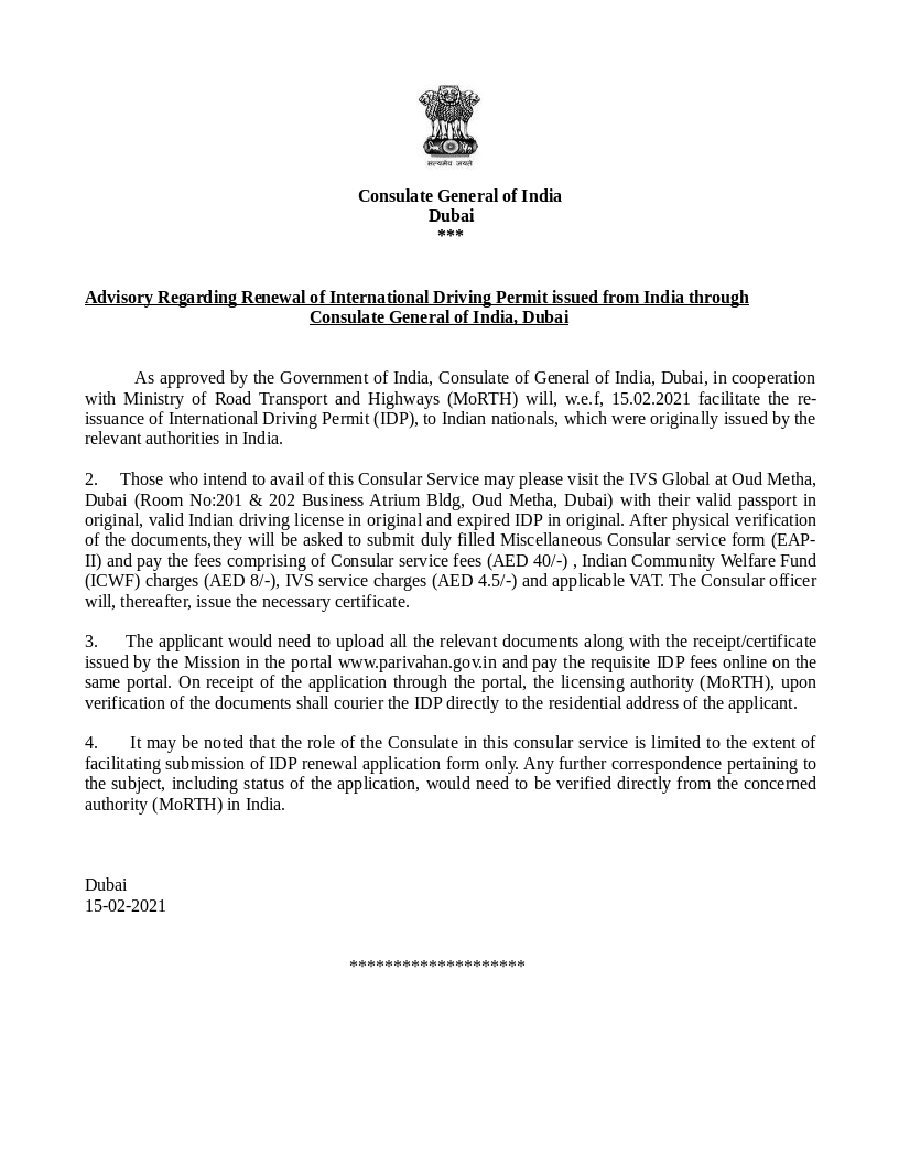 Advisory Regarding Renewal of International Driving Permit issued from India through Consulate General of India, Dubai