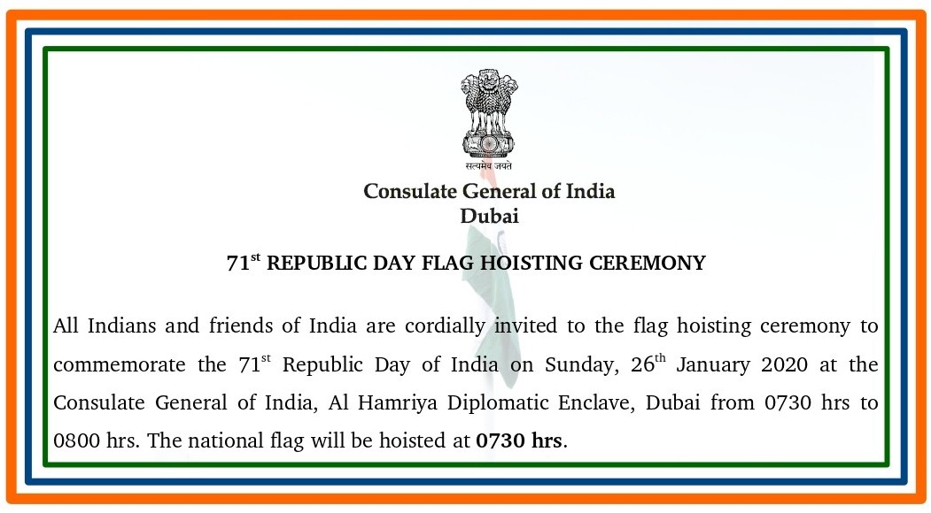 All Indians and friends of India are welcome for the 71st Republic Day flag hoisting ceremony at the Consulate on 26 January, 2020 at 7.30 AM